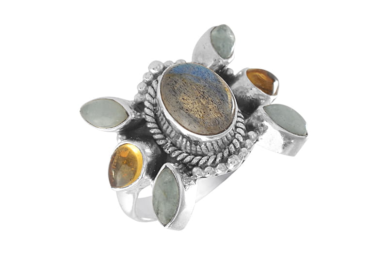 Pierścionek srebrny labradoryt, cytryn, amazonit P348