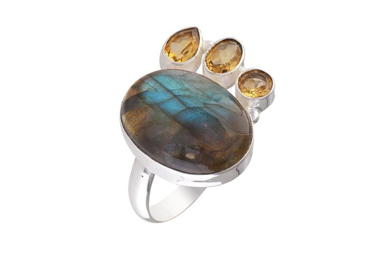Pierścionek srebrny labradoryt, cytryn P377